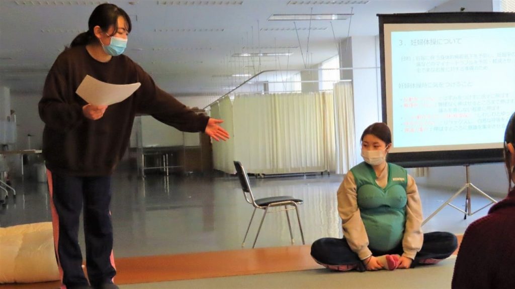 看護学科3年生の助産師科目履修者5名は、1月22日「助産診断・技術学Ⅱ」で3・4年生を対象に妊婦体験ジャケットを着用しながら、妊婦体操(母親教室)の保健指導を行いました。