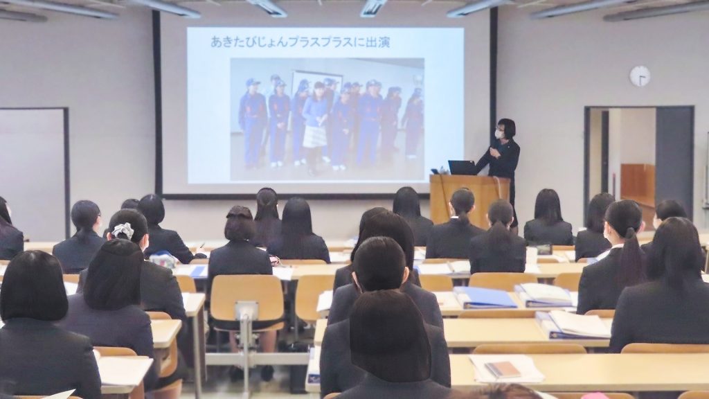 看護学科特別講演会を開催致しました。大館市立総合病院で診療看護師(NP、Nurse Practitioner)として勤務している古川茜様を講師にお迎えして、お話しいただきました。診療看護師とは、患者のQOL向上のために医師や多職種と連携・協働し、倫理的・科学的根拠に基づき一定レベルの診療を行うことができる看護師のことです。講演では、診療看護師として働く前の経歴や、診療看護師資格取得の経緯、1日の業務の流れについて動画や写真を用いて分かりやすく説明していただきました。医師の業務補助を行うだけではなく、看護師として医療者や患者への配慮の大切さについても学生は深く学ぶことができました。また、将来の選択肢の1つとして考えることのできる機会ともなったようです。