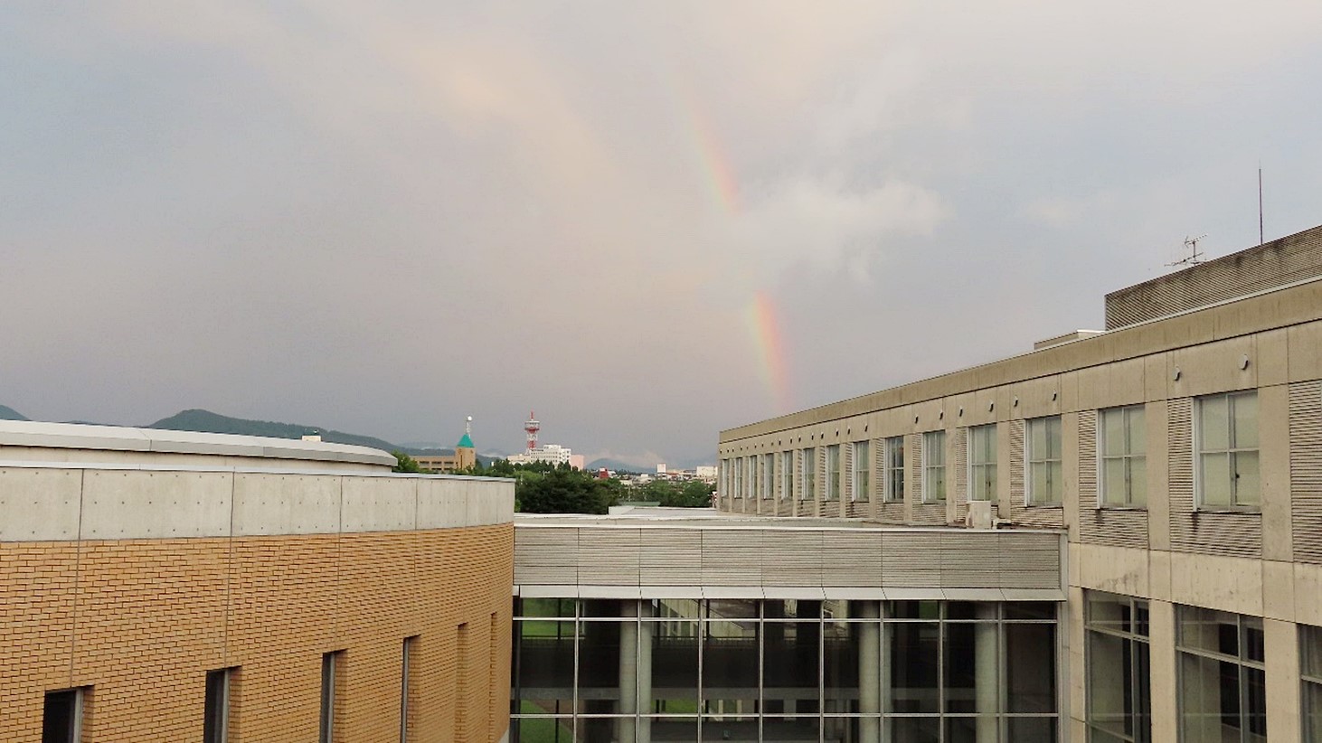 空と雲の位置の関係で晩秋から冬にかけての夕方、秋田キャンパスのある40周年記念館から時折見える美しい光景です。