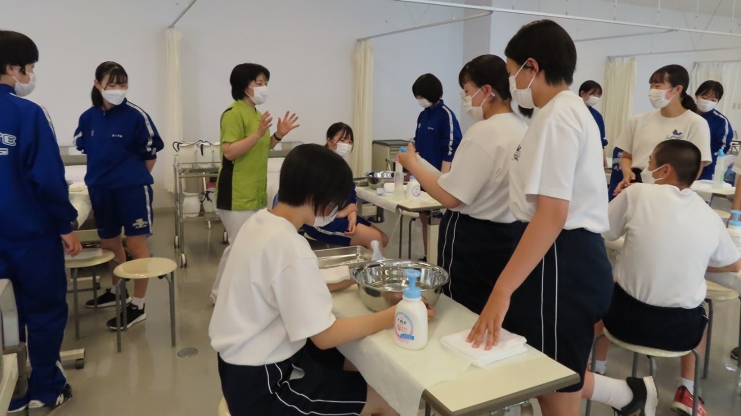 看護学科2年生「母性看護方法論Ⅱ」の授業で、新生児に行う「沐浴」の演習を行いました。沐浴は、大人が入る浴槽ではなく、専用のベビーバスなどにお湯を入れて新生児の身体を洗います。沐浴の目的は、新生児の皮膚を清潔に保ち、新陳代謝を盛んにするためです。教員の見守りの元、学生は1人ずつモデル人形を用いて沐浴を行いました。慣れない援助を同じ姿勢で10分ほどかけて行うので大変そうでしたが、笑顔で演習を行っていました。3年生の領域別実習の前に、再び沐浴の演習を行い、実習では実際の新生児を沐浴することになります。