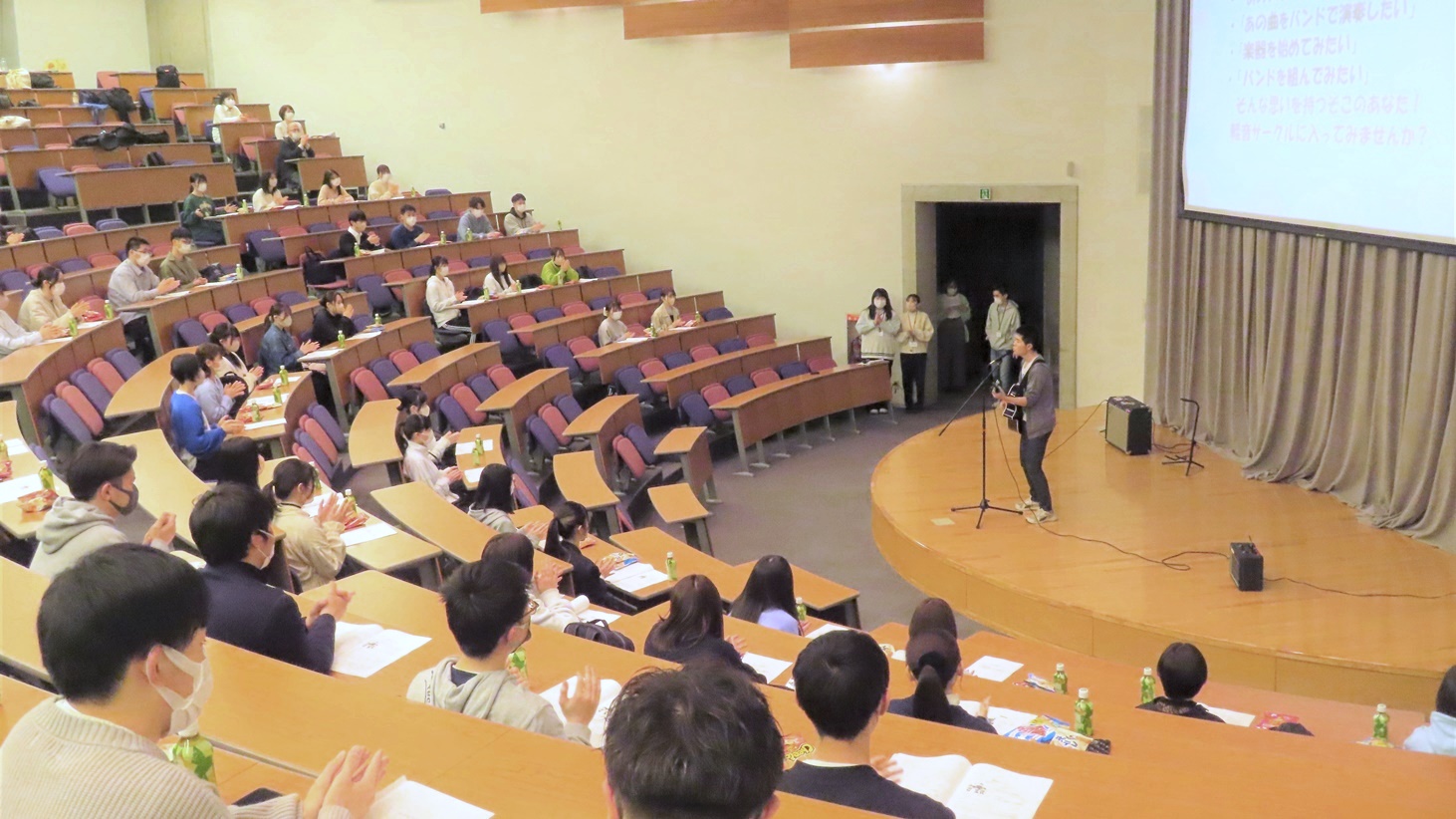 全13サークルからの活動紹介に加え、今年度はサークル紹介冊子を作成し、1年生へ配布しました。各サークルの紹介後、1年生は自分が興味のあるサークルのブースに行き、詳細を聞いていました。 1年生の皆さんは是非サークルに加入し、楽しい大学生活を送ってください。